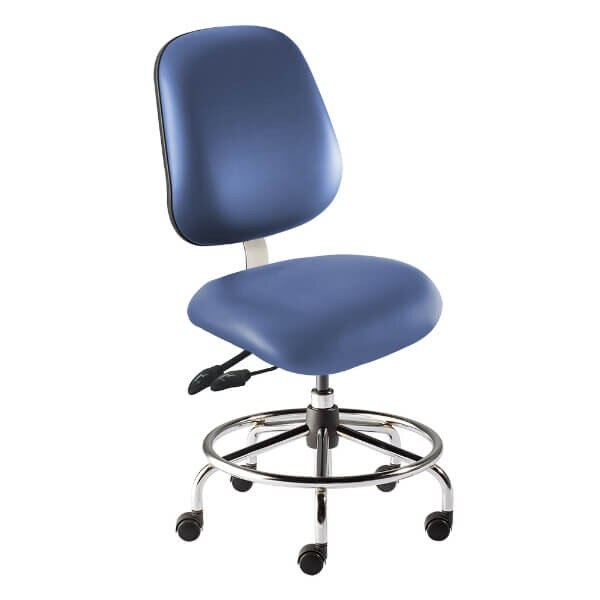 This chair features an ISO 4 cleanroom performance package and is designed for use at 30" to 34" desktop height. Features include a generously proportioned, saddle-shaped contoured seat with waterfall front and internal seat board bumperguard, a roomy backrest with lumbar support and plastic protective panel, and a task control with pneumatic seat-height adjustments from 18" to 22", and convenient backrest tilt and height adjustments. The seat and back are covered with Grade 2 black vinyl upholstery. The chair rests on a durable 23” diameter tubular steel base with affixed 21” footring and dual-wheel, non-marring polyurethane casters that resist movement when the chair is unoccupied. Metal parts have chrome finish. Components packaged under laminar flow cleanroom hood.