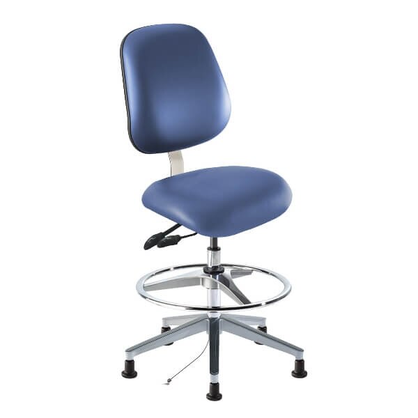 This chair features a combination ISO 6 cleanroom / ESD static control performance package and is designed for use at 34" to 44" high benches. It is constructed to provide continuity throughout the chair to the ground. Features include a generously proportioned, saddle-shaped contoured seat with waterfall front and internal seat board bumperguard, a roomy backrest with lumbar support and plastic protective panel, and a task control with pneumatic seat-height adjustments from 22" to 32", convenient backrest tilt and height adjustments. The seat and back are covered with blue Microcon vinyl upholstery to meet static control needs. The chair rests on a high profile 28.7” diameter wide aluminum base with attached drag chain. Other components include an adjustable 22” footring and 2"-high polyamide glides rated for static control applications. Metal parts have chrome finish.