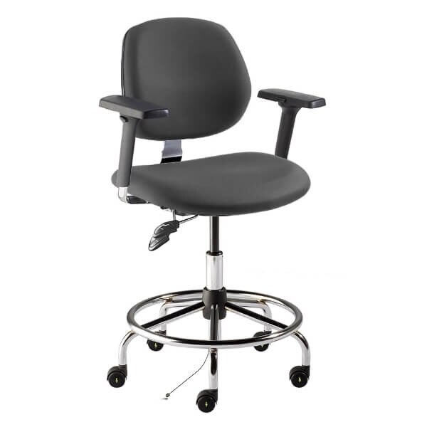 This MVMT Tech Series Heavy Duty model is designed for use at benches 32.5”-39.5” high in combined ISO 6 rated cleanroom and ESD static control applications. It features a roomy upholstered 20.5” wide seat which is mounted forward for a depth of 18”, a medium-sized adjustable backrest with lumbar support, height- and width-adjustable armrests with adjustable pads on solid polished cast aluminum uprights, a durable 23” diameter steel base with affixed 21” diameter footring and dual-wheel casters which resist movement when the chair is unoccupied. Ergonomic task control regulates seat height and backrest angle while keeping the seat fixed at a 3.5-degree rearward angle and includes an adjustable seat-height range of 20.5”-27.5”. Upholstery is black Grade B Microcon vinyl. Metal parts have chrome finish.