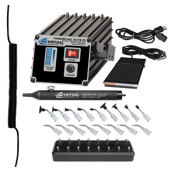 Virtual TV-1500-ELITE-FS-SP8-BD-110 TWEEZER-VAC™ ELITE ESD-SAFE Kit With Foot Switch, Delrin Small Parts Tips And Buna-N Static Dissipative Non-Marking Vacuum Cups With Probes